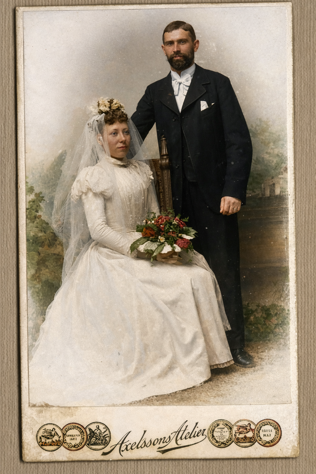 Enligt noteringen vid fotot i albumet där jag hittade bilden skedde brölopppet i Helsingborg den 27/8 1897. Detta är förövrigt den enda bild som jag har hittat på maken Johan