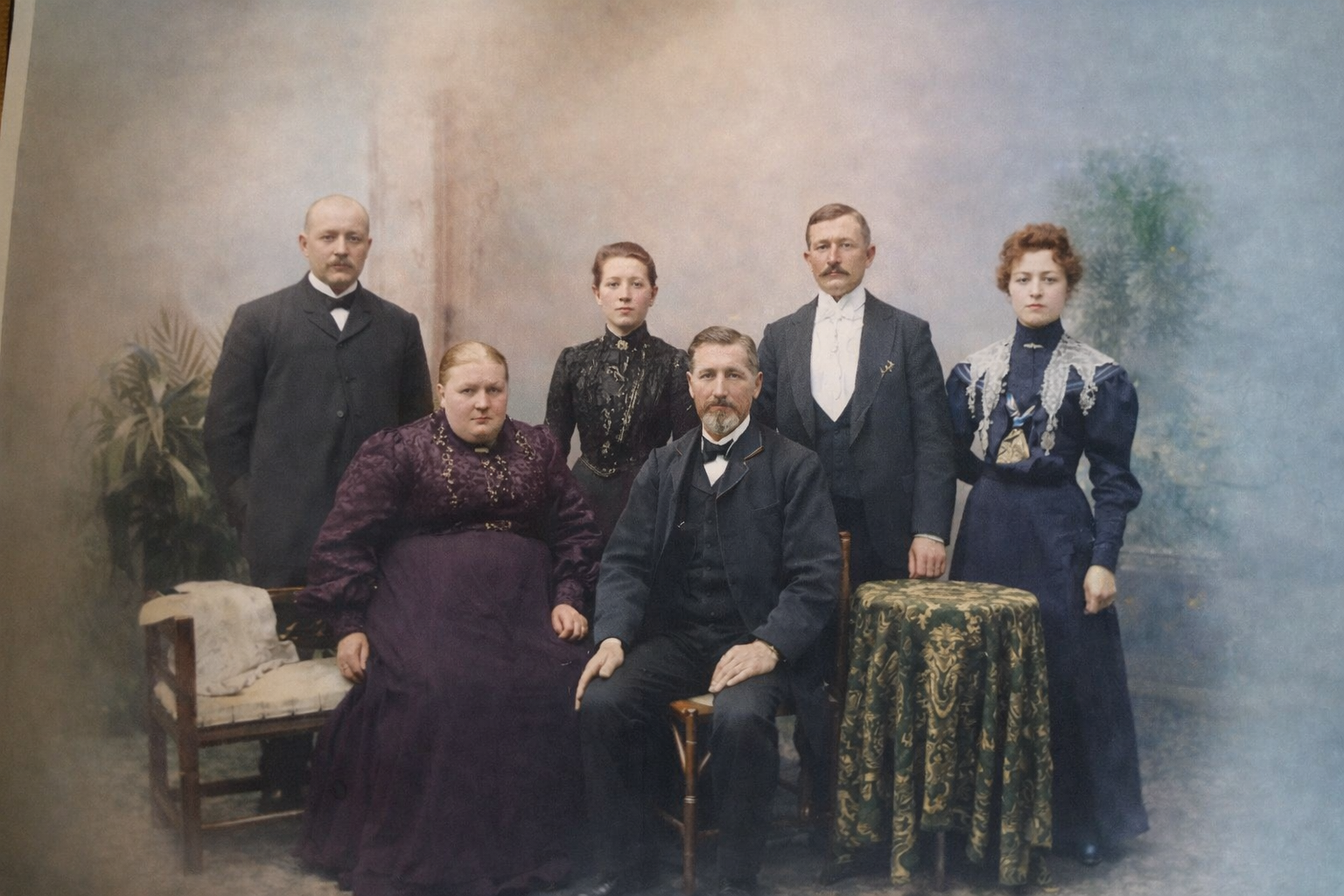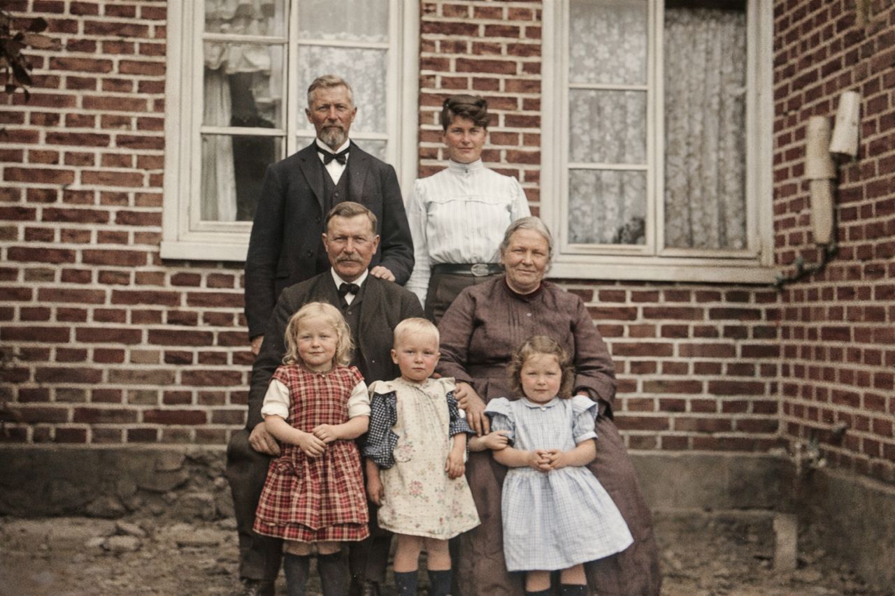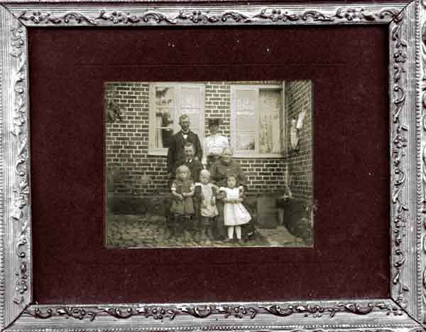 Jonas Olsson med fruJohanna på bakgården av huset på Skepparegatan 17 på Råå. Samt sonen Nils Olof med fru Maria och barnbarnen Alf, Anna och Lizzie