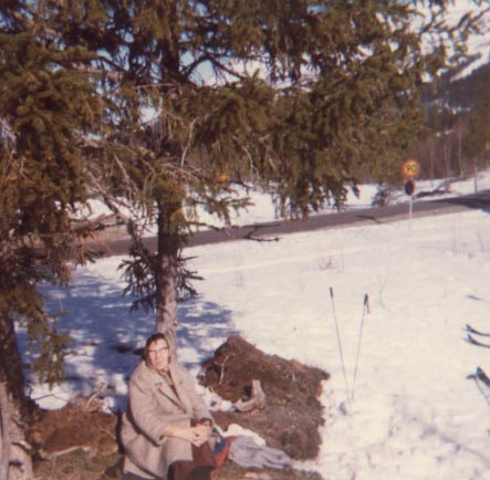 Mojan rastar i ett snöigt landskap på våren 1971 vid ett besök i Östersund