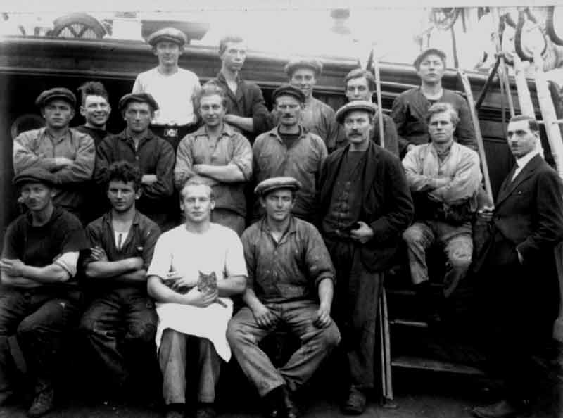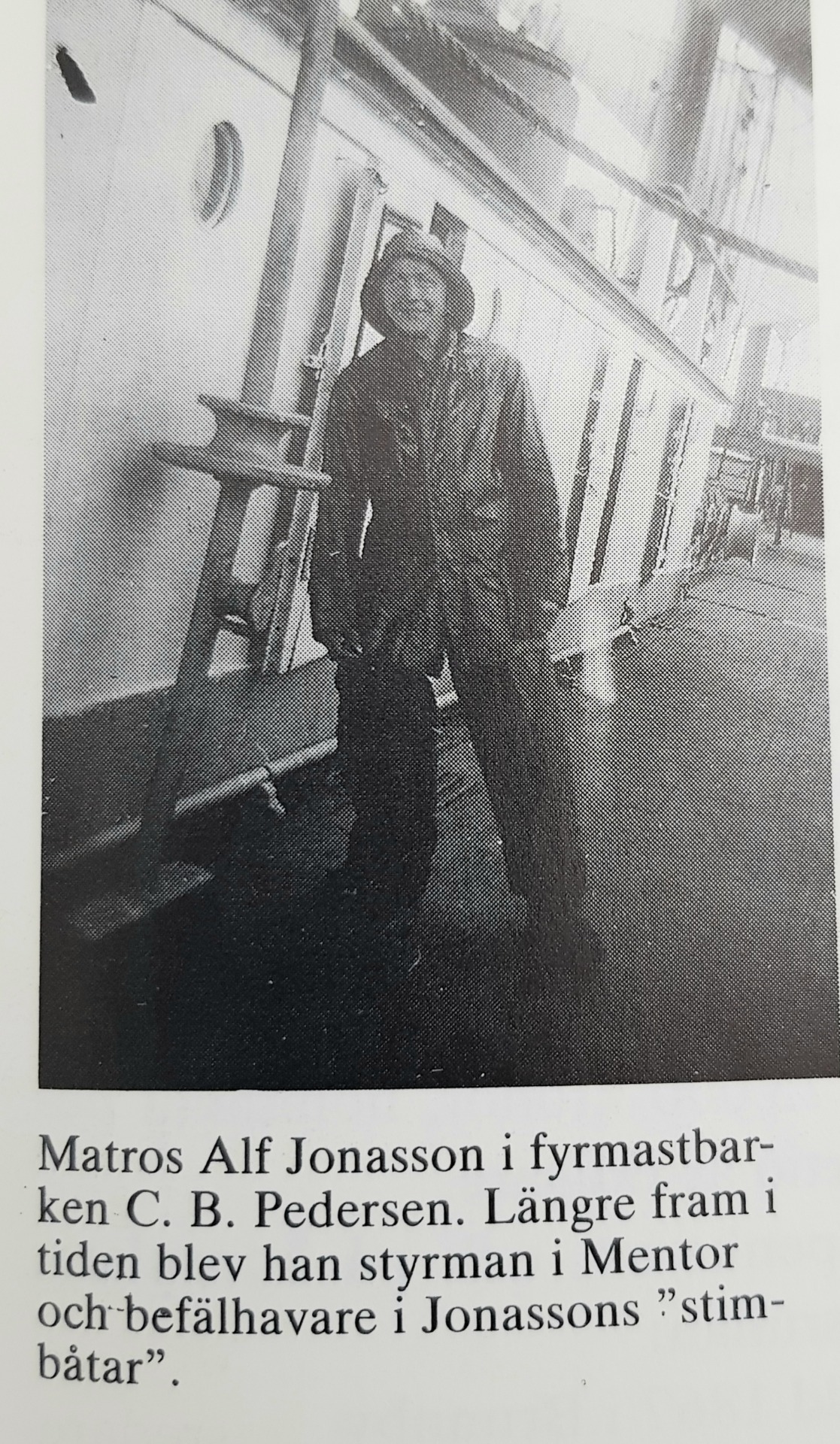 Längst upp på stegen står Alf, troligen matros. Två man till vänster om Alf står Ragnar Möller, bror till Leila Möller som Alf senare gifte sig med.