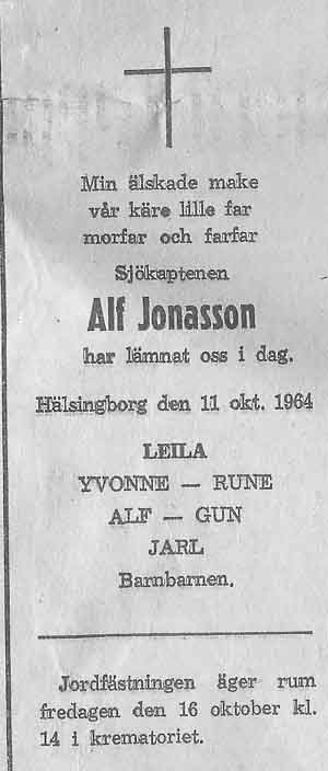 Alf föddes troligen i Råå, och hade tre syskon, som nådde vuxen ålder. Hans föräldrar var välbärgade och de hade ett litet rederi inom släkten. Tror att rederiet hette A,T,H, Jonassons rederi. Det blev senare utökat med fler rederier.