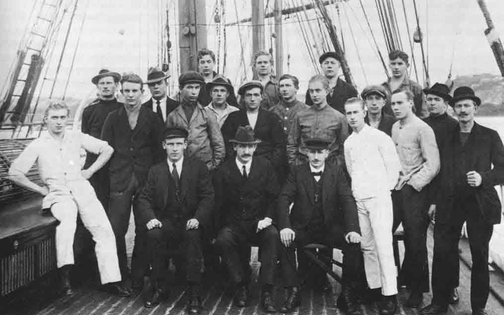 Alf ungefär 20 år, på Transocean ca 1922 Längst upp näst längst till höger. Troligen Ragnar Möller lägst ner andra från höger i ljusgrå jacka. Befälhavare O Björk 1 styrman Eric Wald . Bild från boken Berömda skepp av J Davidsson