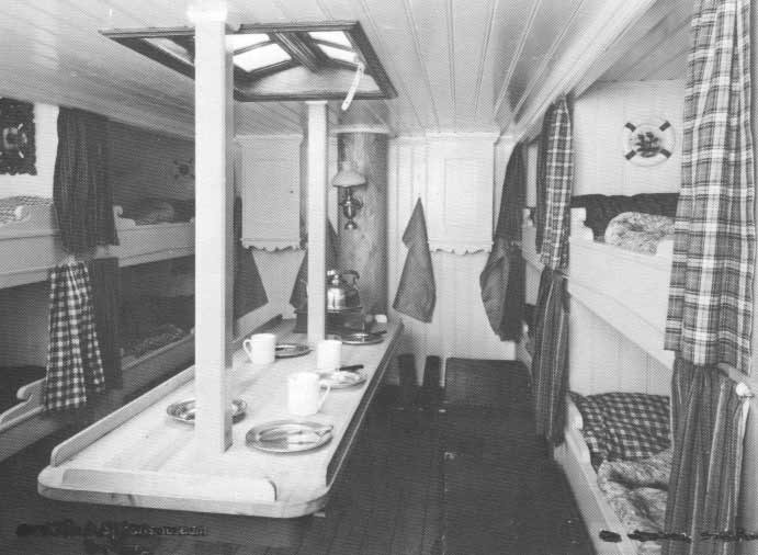 Man kan förstå att det inte var någon lyxtillvaro ombord direkt De som hade hytter eller kajuta bodde akteröver, dvs befäl och kocken, men manskapet bodde i skansen föröver. Man kallade det " för om masten" Precis som i visan av Evert Taube, han hade visst oxå seglat för om masten.
